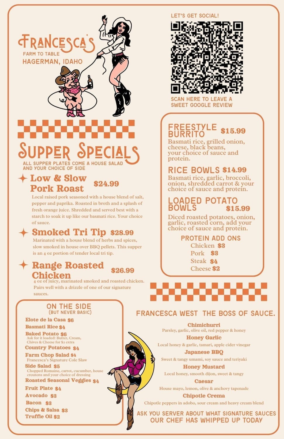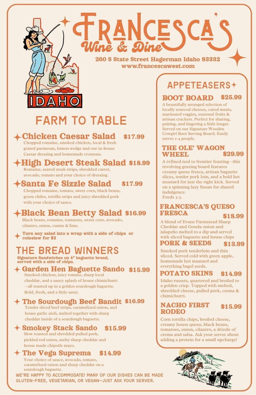 Sign up for Francesca’s Dispatch and get the latest on our Monthly Lineup, Special Events, and frontier feasts straight to your inbox!